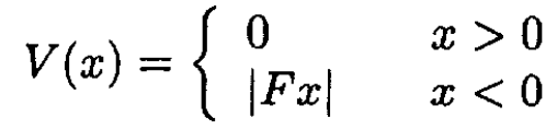 For the present problem we have that V = 0 for x > 0, and this part of the integral exactly cancels the term –kx. For x < 0 the potential is V = -Fx, assuming that F > 0. The turning point is C = -E/F, so we have