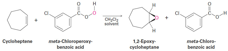 In the laboratory, alkenes are oxidized to give epoxides on treatment with a peroxyacid, RCO3H, such as meta-chloroperoxybenzoic acid. An epoxide, also called an oxirane, is a cyclic ether with an oxygen atom in a three-membered ring. For example: