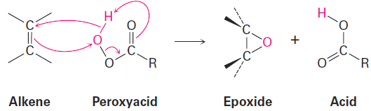 Peroxyacids transfer an oxygen atom to the alkene with syn stereochemistry both C - O bonds form on the same face of the double bond through a one-step mechanism without intermediates. The oxygen atom farthest from the carbonyl group is the one transferred.
