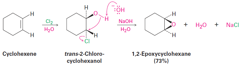 Another method for the synthesis of epoxides involves the use of halohydrins, prepared by electrophilic addition of HO - X to alkenes. When a halohydrin is treated with base, HX is eliminated and an epoxide is produced.