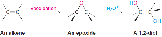 Epoxides undergo an acid-catalyzed ring-opening reaction with water (a hydrolysis) to give the corresponding 1,2-dialcohol, or diol, also called a glycol. Thus, the net result of the two-step alkene epoxidation/hydrolysis is hydroxylation the addition of an - OH group to each of the two doublebond carbons. In fact, approximately 18 million metric tons of ethylene glycol, HOCH2CH2OH, most of it used for automobile antifreeze, are produced worldwide each year by the epoxidation of ethylene and subsequent hydrolysis.