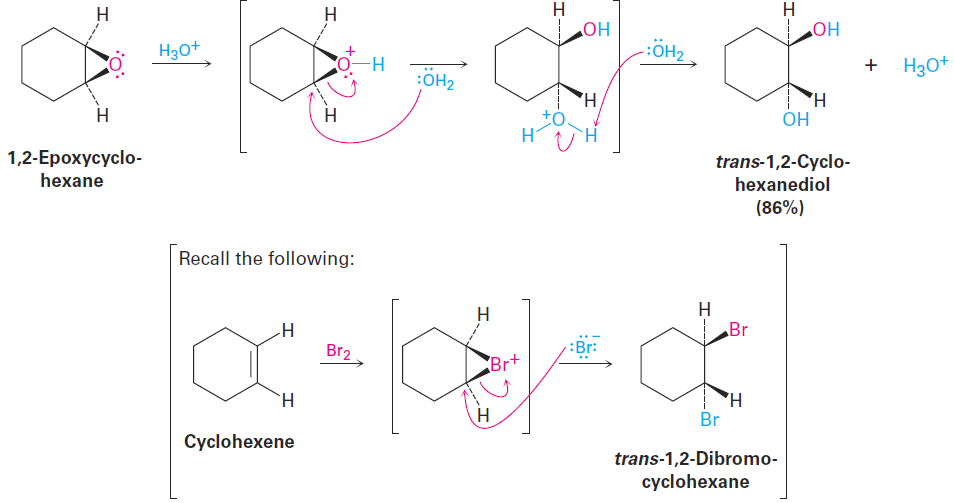 Acid-catalyzed epoxide opening begins with protonation of the epoxide to increase its reactivity, followed by nucleophilic addition of water. This nucleophilic addition is analogous to the final step of alkene bromination, in which a cyclic bromonium ion is opened by a nucleophile. That is, a trans-1,2-diol results when an epoxycycloalkane is opened by aqueous acid, just as a trans-1,2-dibromide results when a cycloalkene is brominated.