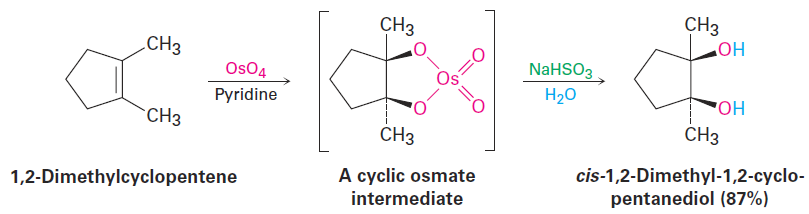 Hydroxylation can be carried out directly (without going through an intermediate epoxide) by treating an alkene with osmium tetroxide, OsO4. The reaction occurs with syn stereochemistry and does not involve a carbocation intermediate. Instead, it takes place through an intermediate cyclic osmate, which is formed in a single step by addition of OsO4 to the alkene. This cyclic osmate is then cleaved using aqueous sodium bisulfite, NaHSO3.