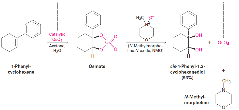 Because OsO4 is both very expensive and very toxic, the reaction is usually carried out using only a small, catalytic amount of OsO4 in the presence of a stoichiometric amount of a safe and inexpensive co-oxidant such as N-methylmorpholine N-oxide, abbreviated NMO. The initially formed osmate intermediate reacts rapidly with NMO to yield the product diol plus N-methylmorpholine and reoxidized OsO4, which reacts with more alkene in a catalytic cycle.
