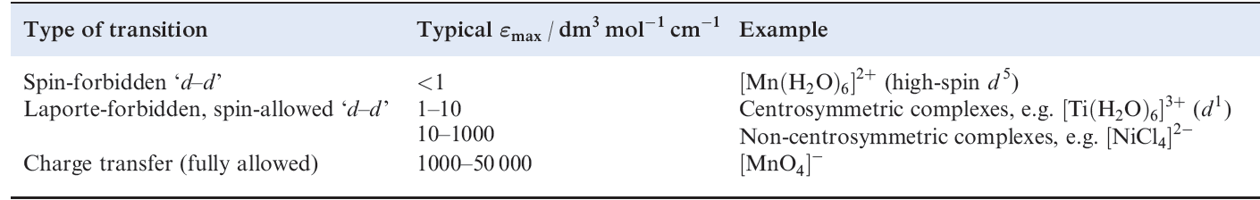 Table 1.1 Typical Ԑmax values for electronic absorptions; a large  Ԑmax corresponds to an intense absorption and, if the absorption is in the visible region, a highly coloured complex.