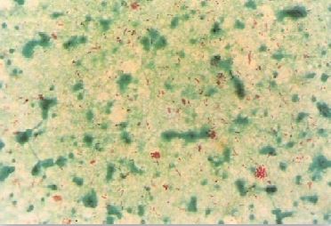 1- تسمى طريقة الصبغ هذه بتقنية صبغة Ziehl – Neelsen ، عند استعمال هذه الصبغة تظهر مستعمرات الجنس البكتيري Mycobacteria Spp . حمراء اللون بخلاف جميع الأنواع الاخرى من الجراثيم البكتيرية والتي تعطي لوناً اخضراً ومن هنا فإن الجنس البكتيري Mycobacteria Spp حمراء اللون بخلاف جميع الأنواع الأخرى من الجراثيم البكتيرية والتي تعطي لوناً اخضراً ومن هنا فإن الجنس البكتيري. Mycobacteria Spp يسمى العصويات المقاومة للحمض acid fast bacilli ، كما يمكن استعمال الصبغة اللاصفة fluorescent stain أو صبغة اليورامين uramine stain وهذه الأصباغ تعطي نتيجة أفضل حيث تظهر الخلايا البكتيرية على هيئة لون أخضر لماع على خلفية سوداء. والوسط الغذائي الذي في الشكل رقم 2.7 يسمى Lowenstein – Jensen ، وكما هو معرو فإن الجنس البكتري Mycobacteria Spp بطيء النمو ويستغرق مدة تتراوح ما بين اسبوعين إلى اثنى عشر أسبوعاً قبل أن تظهر المستعمرات البكتيرية النامية على الوسط الغذائي.