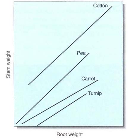 FIGURE :The ratio of root system to shoot system is critically important; for each species, as the root system becomes heavier, so does the shoot system by a characteristic amount. However, the relationship differs for each species: Obviously for a given amount of turnip root there is relatively little shoot, but there is much more shoot for the same amount of pea root, and even more for cotton.