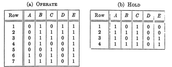 It is awkward to visualize all these conditions at once, but if we use a table to represent the conditions, they are much easier to work with. Tables 1-1(a) and (b) are of the same type as those in Sections (Design of circuits from given properties) and (Design of n-terminal circuits) except that the only rows shown are those corresponding to the combinations for which the function assumes the value 1. All other combinations correspond to the value 0 for the function. Since the inputs will be interpreted as controlling relays, the symbols 0 and 1 refer to the states of relays, a slight extension of the earlier interpretations. 1 will signify that the relay is in the operated state, 0 that it is in the released state.