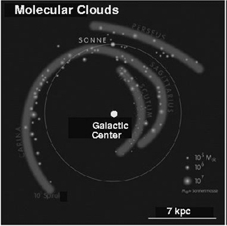 Figure 1.1. The spiral arm structure of the Milky Way derived from the distribution of molecular clouds. Continuous arms become visible. (Image: Huttemeister/Janssen).
