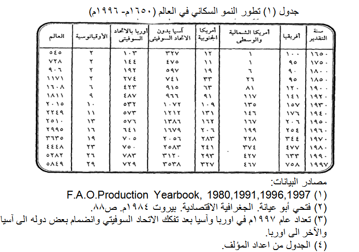 لتوزيع السكان وتركيبهم ومستواهم المعيشي والحضاري ومعتقداتهم الدينية دور كبير في الإنتاج الزراعي، كما ان للنمو السكاني وزيادة الطلب اثره الكبير (جدول 1), فمدى توافر الايدي العاملة وتوعيتها ومستواها ومشاركة المراة للرجل في العمل، وعلاقة الانسان بالأرض خاصة اذا كانت مورده الرئيسي للدخل القومي، ثم مدى توافر الغذاء ونقصه لهؤلاء السكان، كل هذا من شانه ان يكون له الأثر في الإنتاج الزراعي.