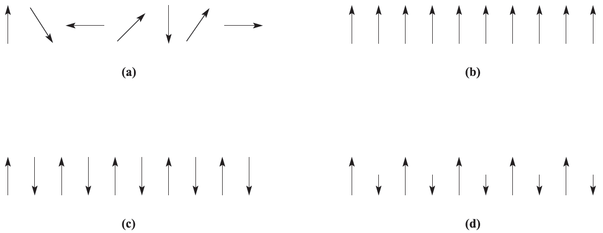 Fig. 1.1 Representations of (a) paramagnetism, (b) ferromagnetism, (c) antiferromagnetism and (d) ferrimagnetism.