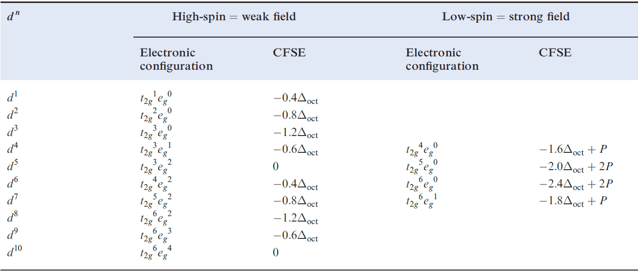 Table 1.1 Octahedral crystal field stabilization energies (CFSE) for dn configurations; pairing energy, P, terms are included where appropriate . High- and low-spin octahedral complexes are shown only where the distinction is appropriate.