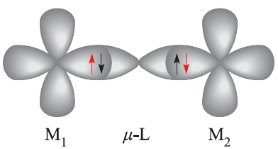 When a bridging ligand facilitates the coupling of electron spins on adjacentmetal centres, the mechanismis one of superexchange. This is shown schematically in diagram 1.1, in which the unpaired metal electrons are represented in red.