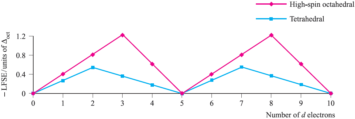Table 1.1 showed the variation in crystal field stabilization energies (CFSE) for high- and low-spin octahedral systems; the trend for high-spin systems is restated in Figure 1.2, where it is compared with that for a tetrahedral field, Δtet being expressed as a fraction of Δoct .