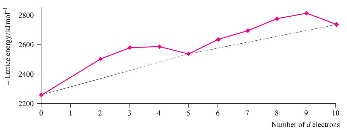 Note the change from CFSE to LFSE in moving from Table 1.1 to Figure 1.2; this reflects the fact that we are now dealing with ligand field theory and ligand field stabilization energies. In the discussion that follows, we consider relationships between observed trends in LFSE values and selected thermodynamic properties of high-spin compounds of the d-block metals. Lattice energies and hydration energies of Mn+ ions Figure 1.3 shows a plot of experimental lattice energy data for metal(II) chlorides of first row d-block elements. In each salt, the metal ion is high-spin and lies in an octahedral environment in the solid state.  The ‘double hump’ in Figure 1.3 is reminiscent of that in Figure 1.2, albeit with respect to a reference line which shows a general increase in lattice energy as the period is crossed. Similar plots can be obtained for species such as MF2, MF3 and [MF6]3-, but for each series, only limited data are available and complete trends cannot be studied.