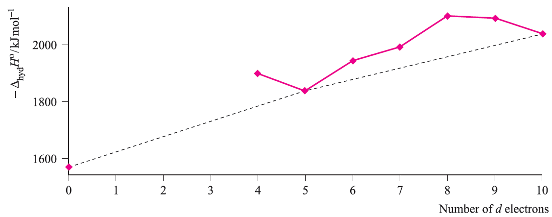 For each plot in Figures 1.3 and 1.4, deviations from the reference line joining the d0, d5 and d10 points may be taken as measures of ‘thermochemical LFSE’ values. In general, the agreement between these values and those calculated from the values of Δoct derived from electronic spectroscopic data are fairly close. For example, for [Ni)H2O(6]2+, the values of LFSE(thermochemical) and LFSE(spectroscopic) are 120 and 126 kJ mol-1 respectively; the latter comes from an evaluation of 1:2 Δoct where Δoct is determined from the electronic spectrum of [Ni(H2O)6]2+ to be 8500 cm-1.