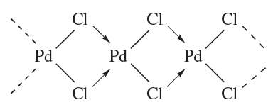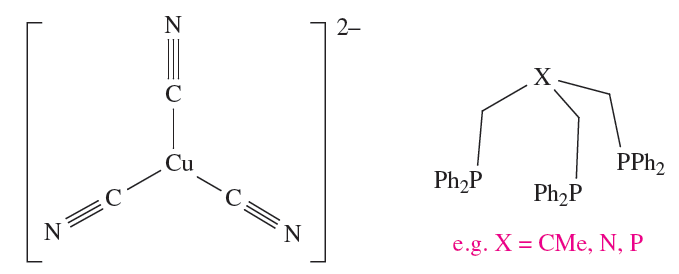 A tripodal ligand (e.g. 1.3) is one containing three arms, each with a donor atom, which radiate from a central atom or group; this central point may itself be a donor atom. In the remaining part of this section, we give a systematic outline of the occurrence of different coordination numbers and geometries in solid state d-block metal complexes. A general word of caution: molecular formulae can be misleading in terms of coordination number. For example in CdI2, each Cd centre is octahedrally sited, and molecular halides or pseudo-halides (e.g. [CN]-) may contain M_X_M bridges and exist as oligomers, e.g. α-PdCl2 is polymeric (1.4).