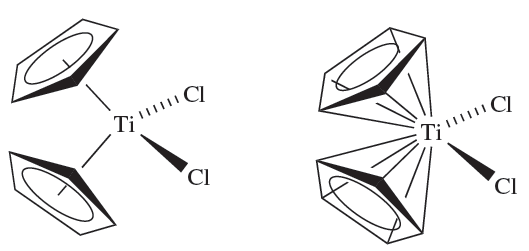 A further ambiguity arises when the bonding mode of a ligand can be described in more than one way. This often happens in organometallic chemistry, for example with cyclopentadienyl ligands, there is still the question of whether to consider, for example, an [η5-C5H5]- ligand as occupying one or five sites in the coordination sphere of a metal atom: thus, the coordination number of the Ti(IV) centre in [(η5-C5H5)2TiCl2] may be represented as either 1.5a or 1.5b.