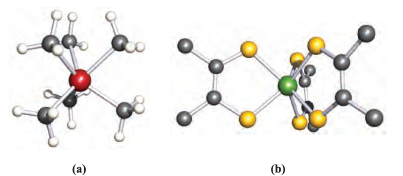 Fig. 1.1 The trigonal prismatic structures of (a) [WMe6] [V. Pfennig et al. (1996) Science, vol. 271, p.626] and (b) [Re(S2C2Ph2)3], only the ipso-C atoms of each Ph ring are shown [R. Eisenberg et al. (1966) Inorg. Chem., vol. 5, p. 411]. Hydrogen atoms are omitted from (b); colour code: W, red; Re, green; C, grey; S, yellow; H, white.