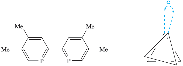 The complexes [WL3], [TiL3]2-, [ZrL3]2- and [HfL3]2- (L is 1.4) also possess trigonal prismatic structures. For a regular trigonal prism, angle α in 1.5 is 00 and this is observed for [TiL3]2- and [HfL3]2-. In [ZrL3]2-, α = 30, and in [WL3], α = 150. Formally, [WL3] contains W(0) and is a d6 complex, while [ML3]2_ (M=Ti, Zr, Hf) contains the metal in a _2 oxidation state. However, theoretical results for [WL3] indicate that negative charge is transferred on to the ligands. In the extreme case, the ligands can be formulated as L2- and the metal as a d0 centre.