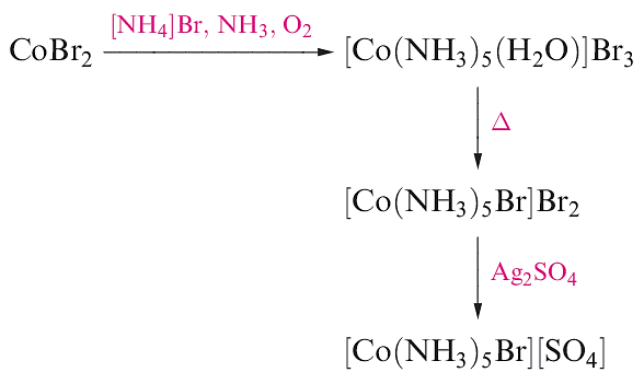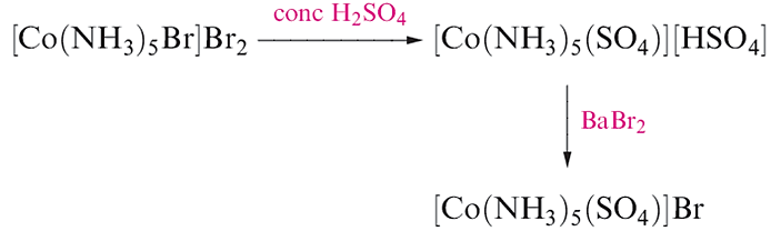 Ionization isomers result from the interchange of an anionic ligand within the first coordination sphere with an anion outside the coordination sphere. Examples of ionization isomers are violet [Co(NH3)5Br][SO4] (prepared by reaction scheme 1.1) and red [Co(NH3)5(SO4)]Br (prepared by reaction sequence 1.2). These isomers can be readily distinguished by appropriate qualitative tests for ionic sulfate or bromide, respectively. The isomers are also easily distinguished by IR spectroscopy; free and coordinated sulfate ions give rise to one or three IR active S_O stretching vibrations respectively.