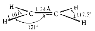 أثبتت بالدليل المباشر بنية الإيتيلين وفق ميكانيك الكم. حيث تظهر دراسات انعراج الالكترونات والدراسات الطيفية أن الإيتيلين (الشكل 1.4) جزيء مستو وبزوايا روابط قريبة جداً من الــ 120 ْ وطول رابطة C – C فيه تساوي 1.34 A مقارنة مع 1.53 A طول الرابطة C – C في الإيتان (انظر الشكل 1.5).