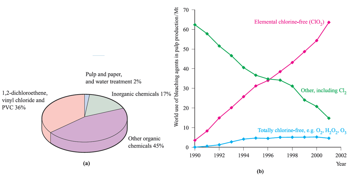 Fig. 1.1 (a) Industrial uses of Cl2 in Western Europe in 1994 [data: Chemistry & Industry (1995) p. 832]. (b) The trends in uses of bleaching agents in the pulp industry between 1990 and 2001; ClO2 has replaced Cl2. Both elemental chlorine-free and totally chlorine-free agents comply with environmental legislations [data: Alliance for Environmental Technology, 2001 International Survey].