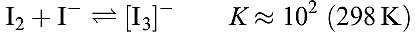 Dichlorine is a more powerful oxidizing agent in aqueous media than Br2 or I2, partly because of a more negative enthalpy of formation of the anion but, more importantly,because the Cl- ion (which is smaller than Br- or I-) interacts more strongly with solvent molecules. (In solid salt formation, the lattice energy factor similarly explains why chloride salts are more exothermic than corresponding bromides or iodides.) Since F2 liberates ozonized O2 from water, the value of Eo for half-reaction 1.1 has no physical reality, but a value of 2.87V can be estimated by comparing the energy changes for each step in scheme 1.2 for X = F and Cl, and hence deriving the difference in Eo for half-equation 1.1 for X = F and Cl. Most of the difference between these Eo values arises from the much more negative value of ΔhydGo of the smaller F- ion (Table 1.1). Diiodine is much more soluble in aqueous iodide solutions than in water. At low concentrations of I2, equation 1.3 describes the system; K can be found be partitioning I2 between the aqueous layer and a solvent immiscible with water (e.g. CCl4).