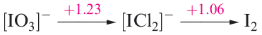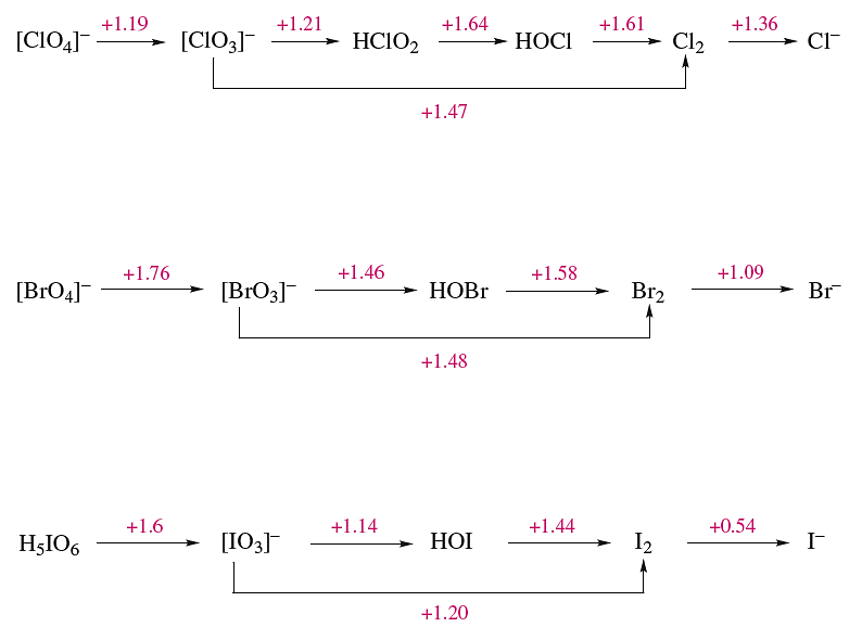Potential diagrams (partly calculated from thermochemical data) for Cl, Br and I are given in Figure 1.1. Because several of the oxoacids are weak, the effects of [H+] on values of some of the reduction potentials are quite complicated. For example, the disproportionation of hypochlorite to chlorate and chloride could be written as equilibrium 1.4 without involving protons.