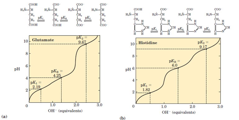 FIGURE 1.1 Titration curves for (a) glutamate and (b) histidine. The pKa of the R group is designated here as pKR.