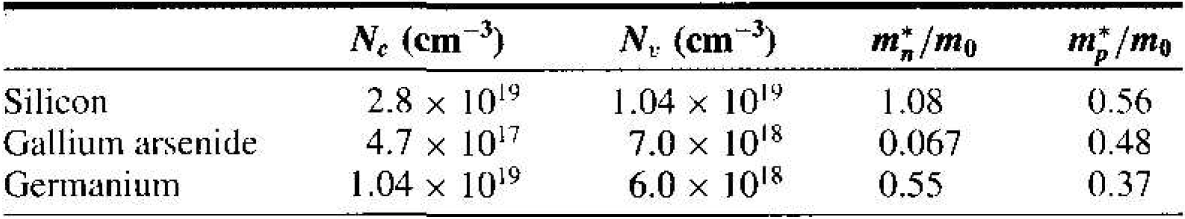 The magnitude of Nv is also on the order of 1019 cm-3 at T = 300 K for most semiconductors The effective density of states functions, Nc and Nv, are constant for a given semiconductor material at a fixed temperature. Table 1.1 gives the values of the density of states function and of the effective masses for silicon, gallium arsenide, and germanium. Note that the value of Nc for gallium arsenide is smaller than the typical 1019 cm-3 value. This difference is due to the small electron effective mass in gallium arsenide.