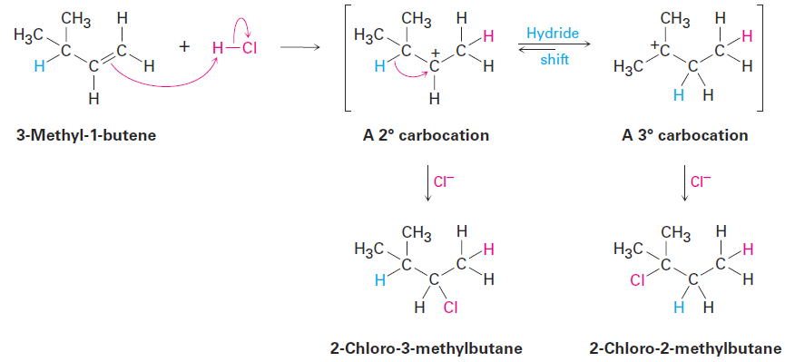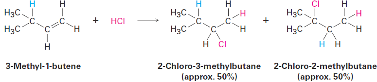 For example, reaction of HCl with 3-methyl-1-butene yields a substantial amount of 2-chloro-2-methylbutane in addition to the “expected” product, 2-chloro-3-methylbutane.