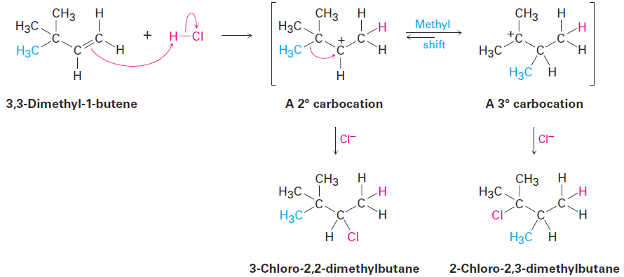 Carbocation rearrangements can also occur by the shift of an alkyl group with its electron pair. For example, reaction of 3,3-dimethyl-1-butene with HCl leads to an equal mixture of unrearranged 3-chloro-2,2-dimethylbutane and rearranged 2-chloro-2,3-dimethylbutane. In this instance, a secondary carbocation rearranges to a more stable tertiary carbocation by the shift of a methyl group.