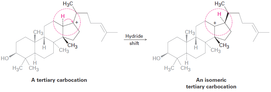 Note the similarities between the two carbocation rearrangements: in both cases, a group (:H- or :CH3-) moves to an adjacent positively charged carbon, taking its bonding electron pair with it. Also in both cases, a less stable carbocation rearranges to a more stable ion. Rearrangements of this kind are a common feature of carbocation chemistry and are particularly important in the biological pathways by which steroids and related substances are synthesized.