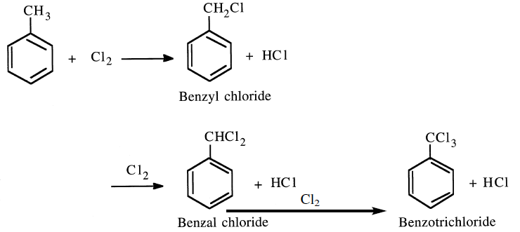 The chlorination of toluene by substituting the methyl hydrogens is a free radical reaction. A mixture of three chlorides (benzyl chloride, benzal chloride and benzotrichloride) results.