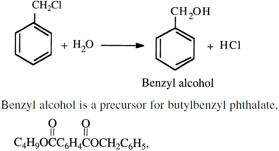 The ratio of the chloride mixture mainly derives from the toluene/chlorine ratio and the contact time. Benzyl chloride is produced by passing dry chlorine into boiling toluene (110°C) until reaching a density of 1.283. At this density, the concentration of benzyl chloride reaches the maximum. Light can initiate the reaction. Benzyl chloride can produce benzyl alcohol by hydrolysis: