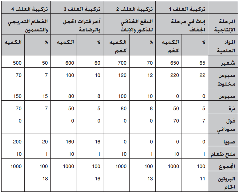 جدول يبين تراكيب علفية حسب المراحل الانتاجية للقطيع