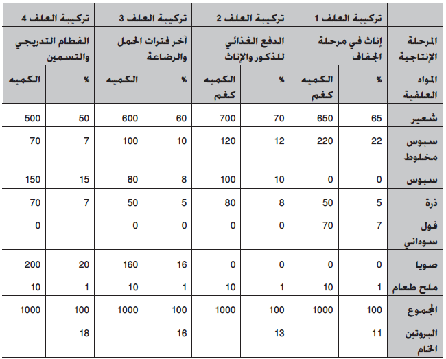 جدول يبين تراكيب علفيه حسب المراحل الإنتاجية للقطيع