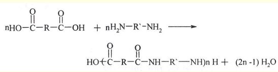 تفاعلات البلمرة التكثيفية : تفاعلات الاحماض الكربوكسيلية الثنائية القاعدة مع المركبات الثنائية الأمين لتكوين البولي أميدات Polymides،