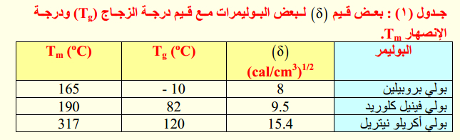 وفي الجدول (1) بعض قيم (δ) لبعض البوليمرات مع قيم درجة الزجاج (Tg) ودرجة الانصهار (Tm).