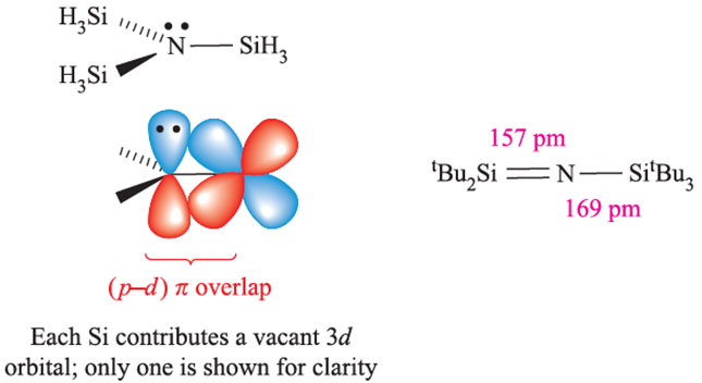 The NSi3 skeleton in N(SiH3)3 is planar and the N_Si bond distance of 173pm is shorter than the sum of the covalent radii, ∑rcov similarly, in (H3Si)2O, the Si_O_Si bond angle of 1448 is large (compare 1118 in Me2O) and the Si_O bonds of 163pm are shorter than ∑rcov. Trigermylamine is isostructural with N(SiH3)3, but P(SiH3)3 is pyramidal with P_Si bonds of length 225 pm. In (H3Si)2S, the Si_S_Si bond angle is 978 and the Si_S bond distances (214 pm) are consistent with a bond order of 1. For many years, these data have been taken as an indication that N and O take part in (p–d)π-bonding with Si there being no corresponding interactions in Si_P or Si_S bonds. However, recent arguments centre around the planarity of N(SiH3)3 (and related strengthening of Si_N and Si_O bonds) being due to n(N)→σ*(Si_H) electron donation, where n(N) represents the non-bonding (lonepair) electrons of the N atom. This is so-called negative hyperconjugation,† and is analogous to the donation of electrons from a d-block metal centre to a σ*-orbital of a PR3 ligand that we describe in Section 20.4. A stereoelectronic effect also contributes to N(SiH3)3 being planar. The polarity of the N_Si bonds (X P(Si)=1.9, X P (N) = 3.0) is such that there are significant long-range electrostatic repulsions between the SiH3 groups. These are minimized if the NSi3-skeleton in N(SiH3)3 adopts a trigonal planar, rather than pyramidal, geometry. The possibility of (p–d)π-bonding in N(SiH3)3 should not be confused with the (p–p)π-bonding which occurs in, for example, Si=N bonds (with a formal bond order of 2) in compounds such as tBu2Si=NSitBu3. Notice that the nitrogen atom is in a linear environment and can be considered to have a stereochemically inactive lone pair, possibly involved in π-interactions.