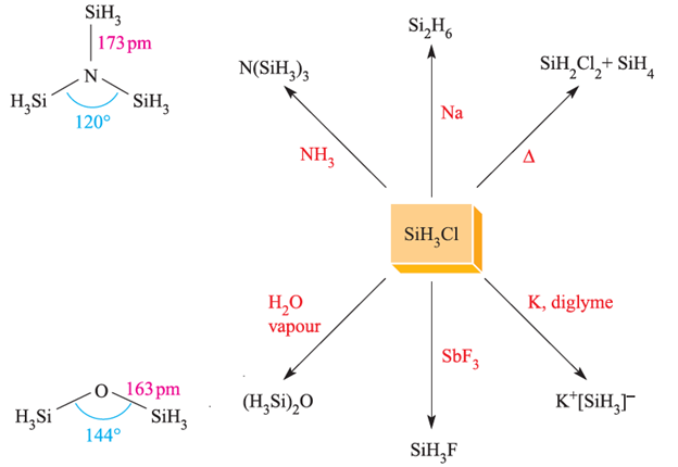 The halo-derivatives SiH2X2 and SiH3X (X=Cl, Br, I) can be prepared from SiH4 and some reactions of SiH3Cl (bp 243 K) are shown in Figure 1.1. The ease with which SiHnX4-n compounds hydrolyze releasing HX means that they must be handled in moisture-free conditions. The preparation and reactivity of GeH3Cl resemble those of SiH3Cl. The structures of trisilylamine, N(SiH3)3, and disilyl ether, (H3Si)2O, are shown in Figure 1.1.