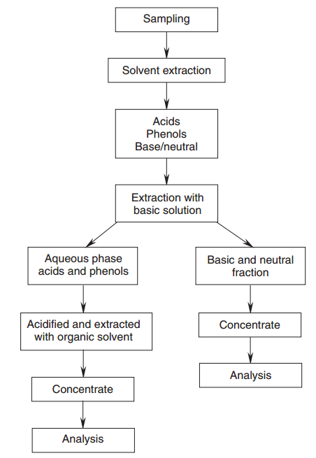 analytes partition into the aqueous phase. The organic phase is con centratedand is ready for further cleanup or analysis. The aqueous phase is aci dified and extracted with an organic solvent, which is then concentrated (ifneeded) and is ready for analysis of the acid analytes (Figure 1.1).