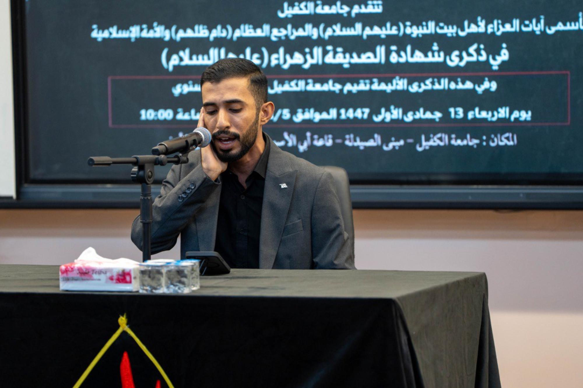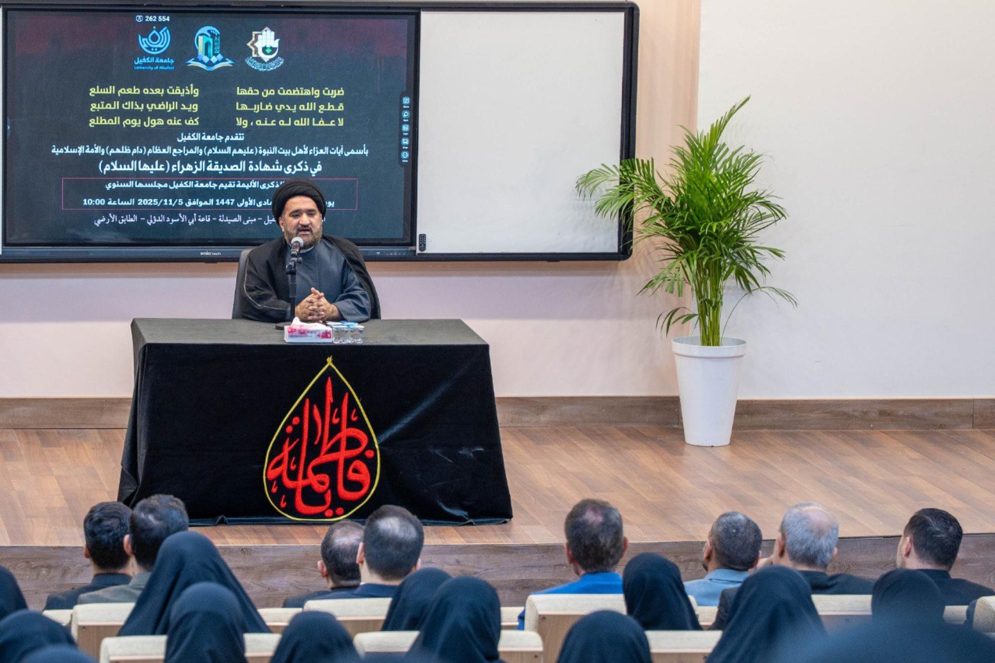 أقام قسم الإرشاد النفسي والتوجيه التربوي في جامعة الكفيل مجلس عزاء بذكرى شهادة السيدة فاطمة الزهراء (عليها السلام). وشهد المجلس حضور رئيس الجامعة الدكتور نورس محمد شهيد الدهان وعدد من عمداء الكليات والتدريسيين والمنتسبين وطلبة الجامعة. واستهل المجلس بتلاوة آيات من الذكر الحكيم بصوت القارئ علي الزبيدي من معهد القرآن الكريم في النجف الأشرف التابع للعتبة العباسية المقدسة، أعقبتها محاضرة قدمها الخطيب مهيب الأعرجي تناول فيها محطات من حياة السيدة الزهراء (عليها السلام)، مبرزًا ما قدمته من نموذج فريد في الإيمان والحكمة والشجاعة في الدفاع عن الرسالة الإسلامية. وتطرق الأعرجي إلى الأثر الحضاري والأخلاقي الذي تركته السيدة الزهراء (عليها السلام) في المجتمع، مبينًا أن سيرتها تمثل مصدرًا في تعزيز مكانة المرأة ودورها الريادي في بناء جيل واعٍ ومتماسك.
