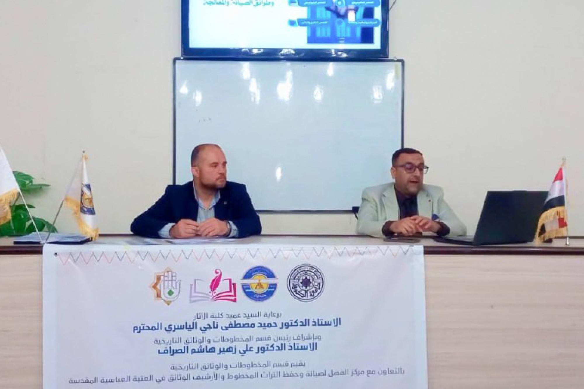 قدّم قسمُ الشؤون الفكرية والثقافية في العتبة العبّاسية المقدّسة، محاضرتَينِ علميّتَينِ في مجال ترميمِ المخطوطاتِ والوثائقِ لطلبةِ جامعةِ الكوفة. وقال مديرُ مركزِ الفضلِ لصيانةِ وحفظِ التراثِ المخطوطِ والأرشيفِ الوثائقيّ التابعِ للقسم السيد ليث لطفي: إنّ "المحاضرتين جاءتا استِكمالاً لمشروع المركز الهادف إلى المحافظة على التراث الوثائقيّ والمخطوط في المنطقة، من خلال دعم المؤسّسات العلمية والأكاديمية والباحثين والمكتبات العامّة والخاصّة في العراق". وأضاف: أن "المحاضرة الأولى تناولت البنية المادّية للمخطوطات التاريخية، وقدّمها مديرُ قسم الترميم في المركز، السيد لطيف عبد الزهرة حمزة، فيما استعرضت المحاضرة الثانية العوامل الطبيعية والمناخية المؤثّرة في المخطوطات والوثائق".
