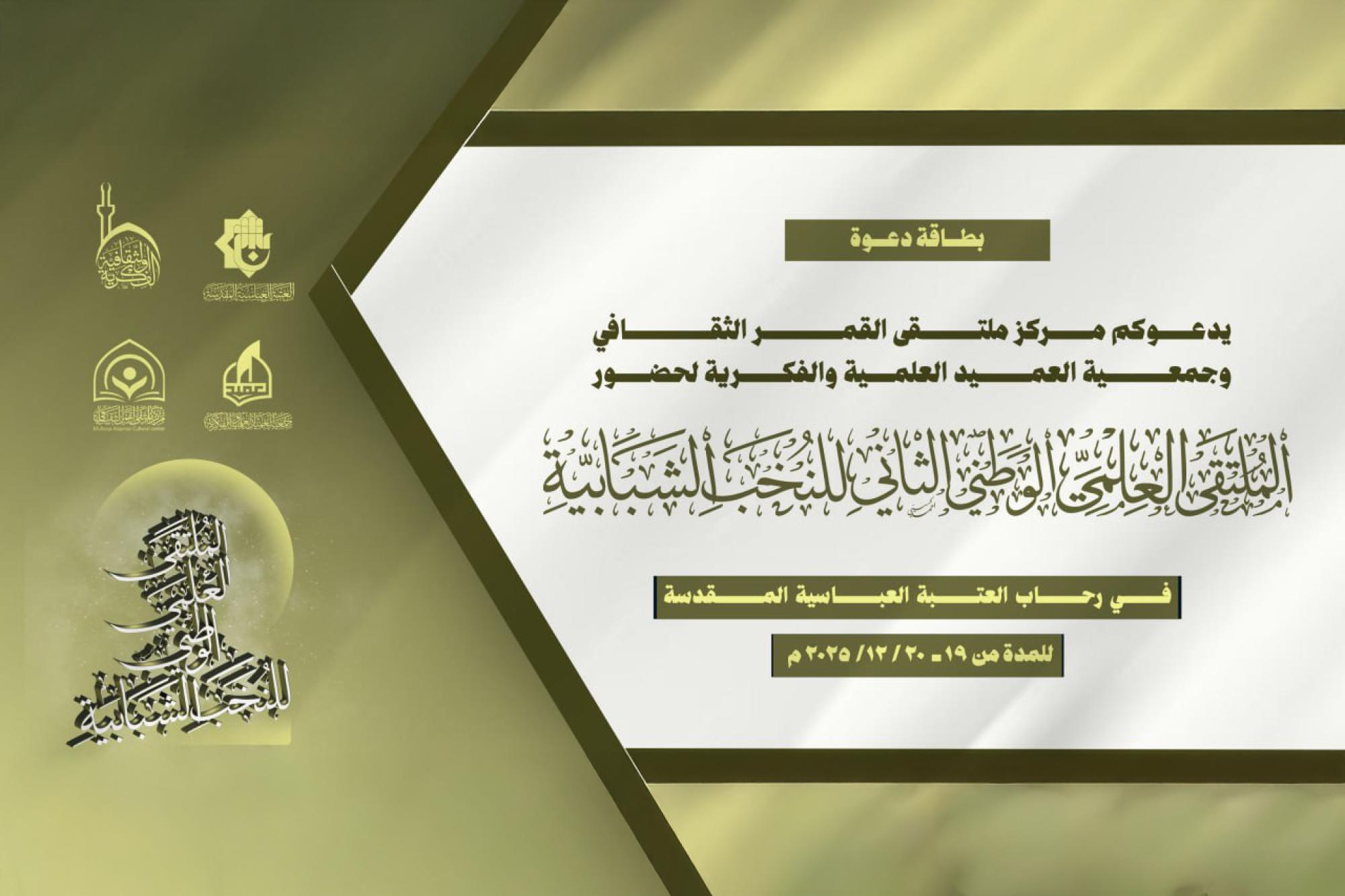تدعو جمعيَّة العميد العلميَّة والفكريَّة ومركز ملتقى القمر الثَّقافي التابع لقسم الشؤون الفكرية والثقافية في العتبة العباسية المقدسة الباحثين لحضورِ فعاليَّاتِ الملتقى العِلميّ الوطنيّ الثاني للنُّخب الشبابيَّة. وتُقام فعاليات الملتقى برعاية العتبة العباسية المقدسة ولمدة يومين متتاليين.