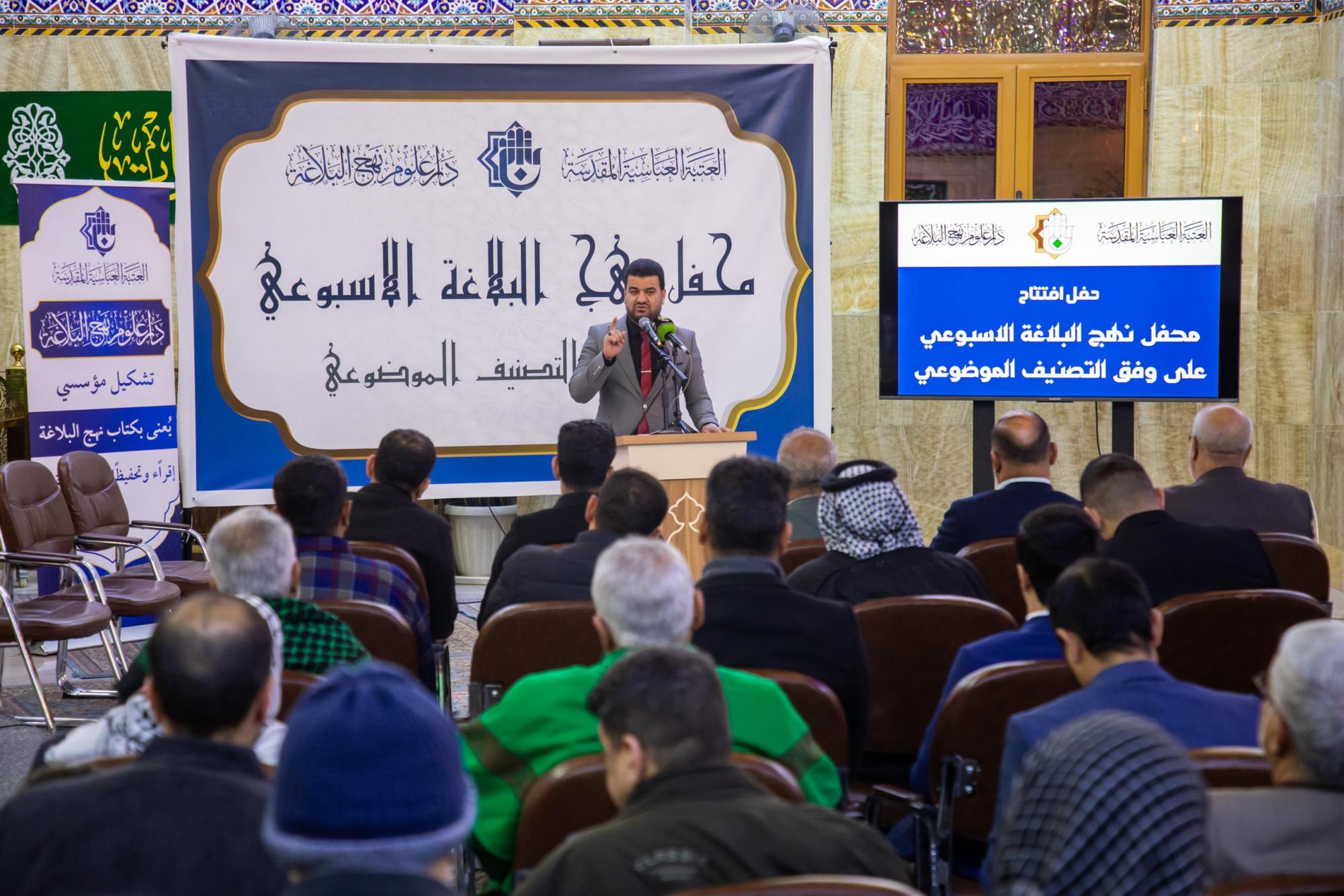 أطلقت دار علوم نهج البلاغة في العتبة العباسية المقدسة محفل نهج البلاغة الأسبوعي على وفق التصنيف الموضوعي، في مقام الإمام المهدي (عجل الله فرجه). واستهل حفل الانطلاق بتلاوة آيات قرآنية بصوت القارئ مهدي العسكري، أعقبتها قراءة سورة الفاتحة على أرواح الشهداء، ثم كلمة لرئيس الدار الدكتور لواء عبد الحسن العطية، وعرض فيلم وثائقي عن أنشطة الدار، وكلمتان للحافظ الشيخ هاني الربيعي ومحاضر المحفل الشيخ محمد الراشدي. وقال الدكتور لواء العطية: إنَّ "المحفل سيقام بشكل أسبوعي، لاستيعاب موضوعات كتاب نهج البلاغة وفق محاوره المرتبطة بالعقيدة والأخلاق والإدارة والاجتماع وقضايا المجتمع وبناء الإنسان وتربيته". وأضاف أنَّ "المحفل يهدف إلى دراسة نهج البلاغة دراسة علمية وفق آلية المنهج الموضوعي الذي يستهدف فئة متنوعة من المشاركين القادمين من مختلف المحافظات".
