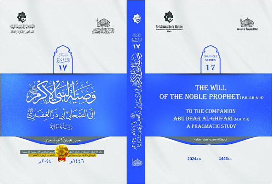 أصدر قسمُ الشؤون الفكرية والثقافية في العتبة العبّاسية المقدّسة، العدد السابع عشر ضمن سلسلة السيرة للرسائل والأطاريح الجامعية. وأشرفت على إصدار العدد دارُ الرسول الأعظم(صلّى الله عليه وآله) التابعة للقسم، والتي تُعنى بإحياء السيرة النبوية الشريفة عبر مشاريع علمية متخصّصة. وجاء العدد بعنوان: (وصيّة النبيّ الأكرم صلّى الله عليه وآله إلى الصحابيّ أبي ذر الغفاري.. دراسة تداولية)، وهو من تأليف الدكتور حيدر عيدان كاظم السعدي. وقال رئيسُ الدار، الدكتور عادل نذير: إن "هذا الإصدار يُعدّ في الأصل رسالة ماجستير حازت على المرتبة الأولى في المسابقة الدولية الثانية للرسائل والأطاريح الجامعية، التي أقامتها دارُ الرسول الأعظم(صلّى الله عليه وآله)، لما تضمّنته من معالجةٍ علميّة متميّزة للوصايا النبويّة من منظورٍ تداوليّ".