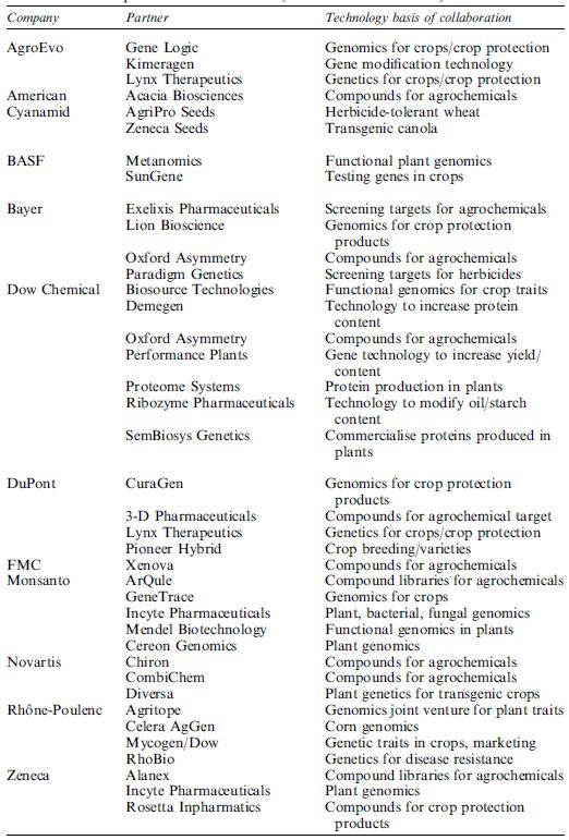 Table . Major companies involved in commercialisation of transgenic crops and their alliances .